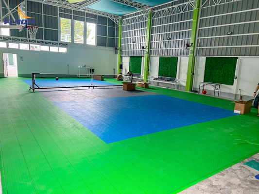Te powierzchnie podłogowe z płytek PP są wykonane z wysokoudarowego kopolimeru polipropylenu, co sprawia, że są odporne na intensywne użytkowanie i różne warunki atmosferyczne, co jest idealne dla boisk sportowych, które doświadczają dużego ruchu pieszych i użytkowania sprzętu. Materiał zapewnia również doskonałą przyczepność i amortyzację wstrząsów, zmniejszając ryzyko obrażeń i zmęczenia wśród sportowców. Dostępność kolorów takich jak czerwony, niebieski i zielony pozwala na personalizację, aby dopasować się do kolorów zespołu lub osobistych preferencji, dodając żywy i profesjonalny wygląd każdemu obiektowi sportowemu.